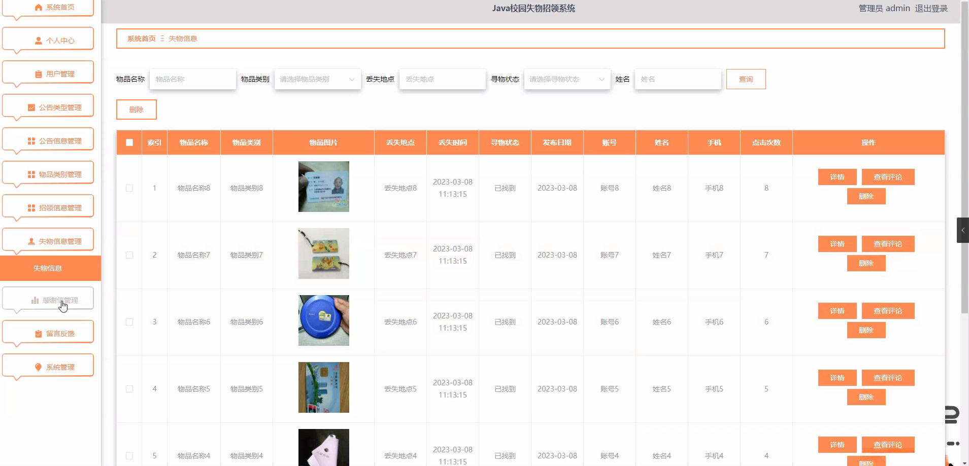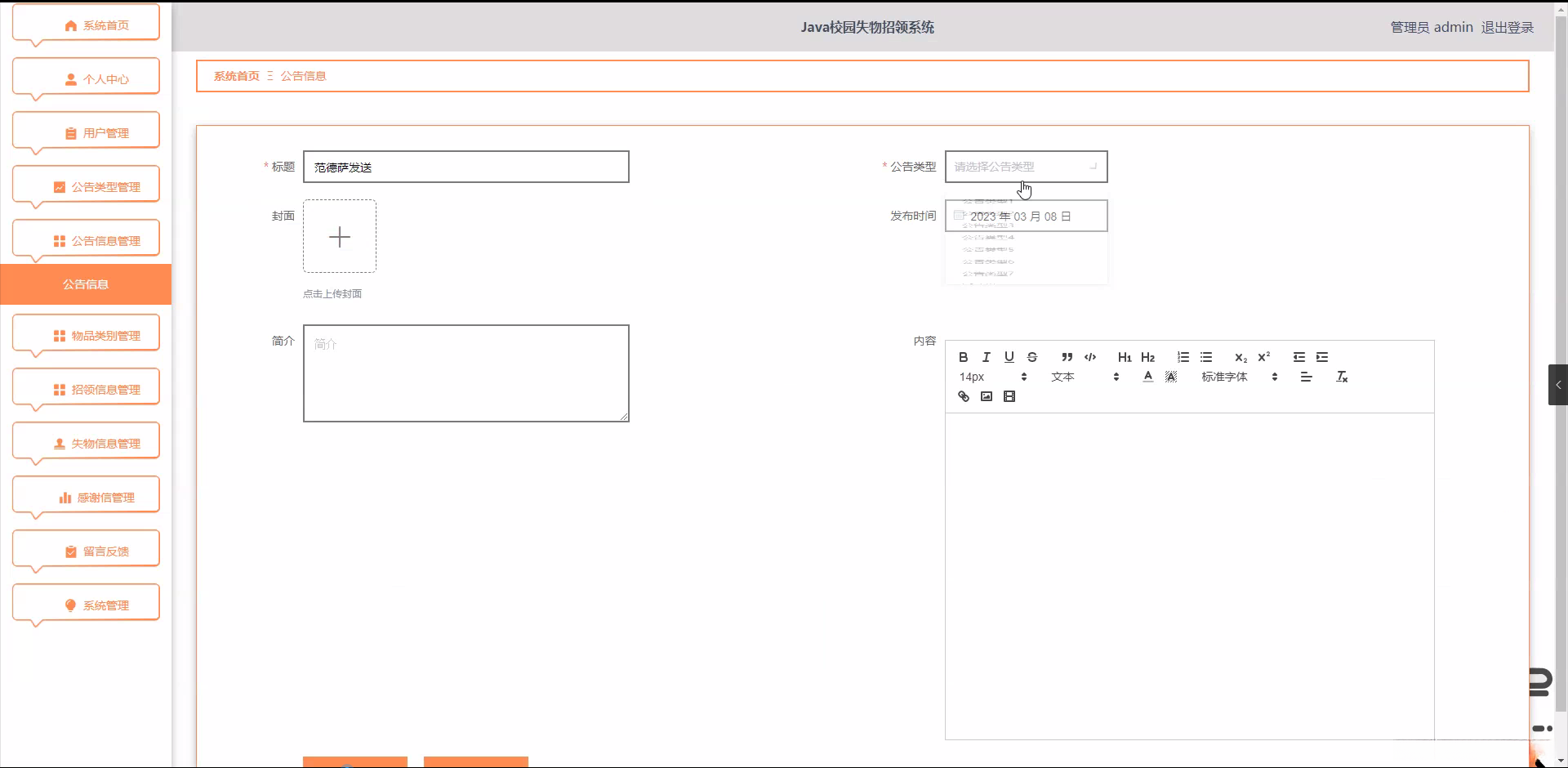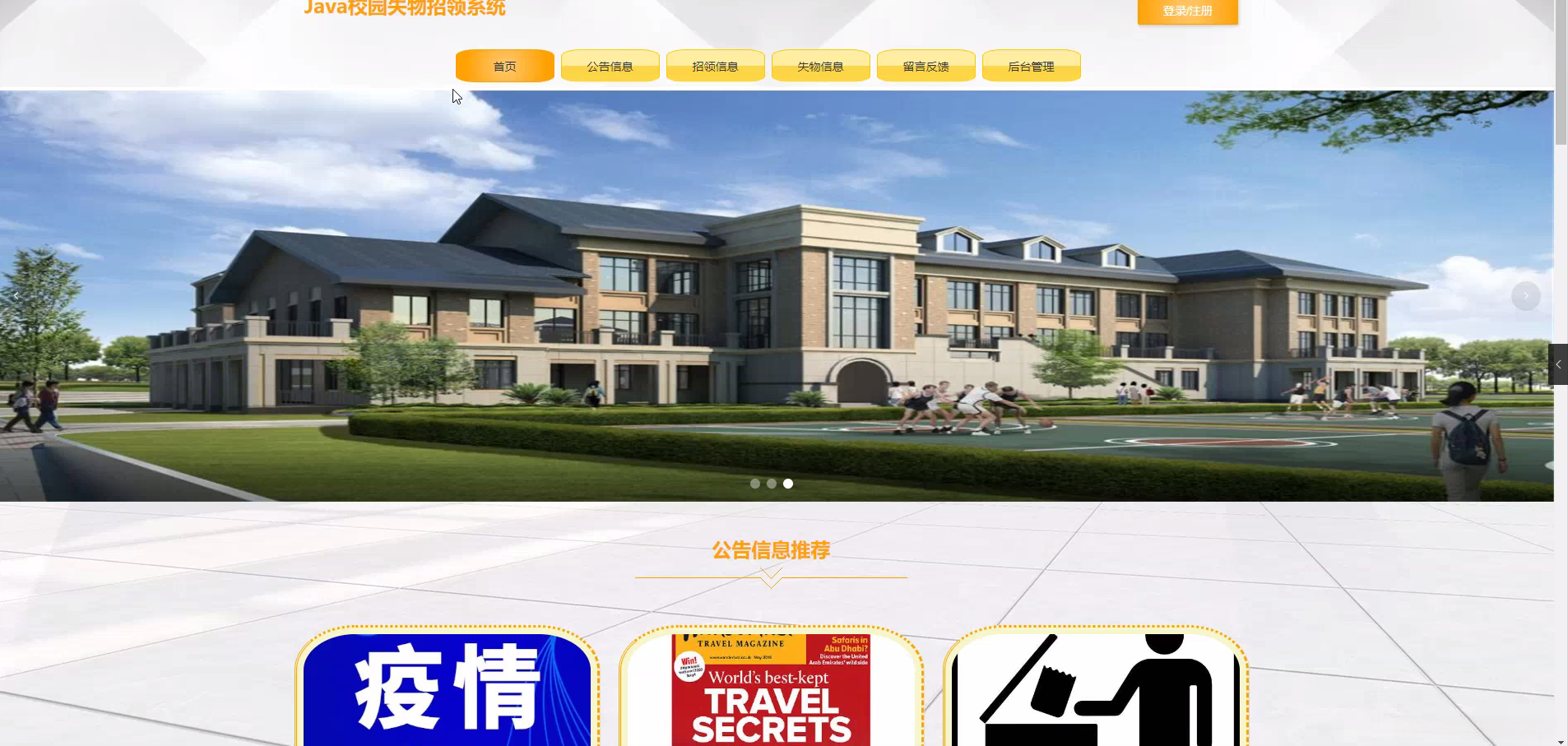 研究背景: 在校园生活中普遍存在着失物招领问题并具有重要意义的学生由于繁重的学习任务与各种课外活动常常会不小心丢失个人财物传统的失物招领方式主要包括依靠物理公告栏或是通过口头通知的方式这些方法存在诸多不足之处如信息传达范围受限更新机制缓慢以及遗失物品难以快速找到等问题。伴随信息技术的快速发展基于互联网的校园 lost property 管理系统能够有效解决这些问题为学校提供了一个更加便捷高效的学生物品管理解决方案。