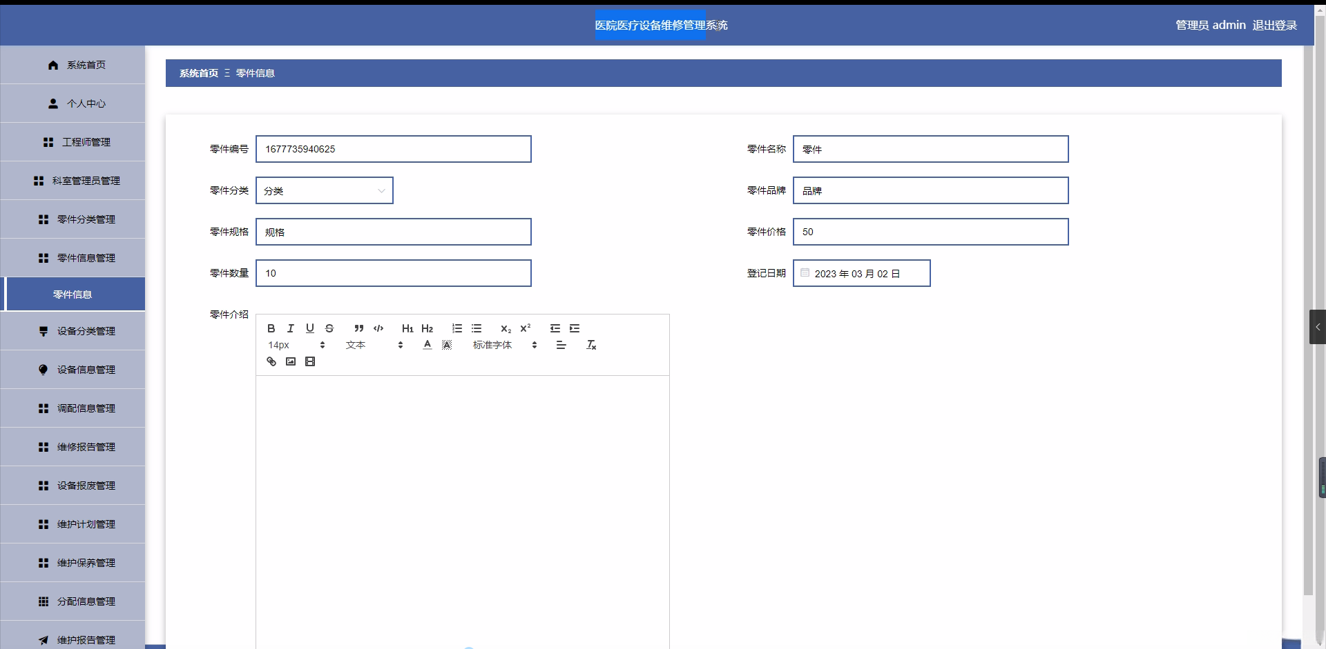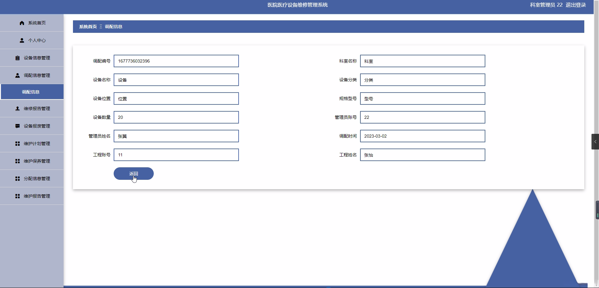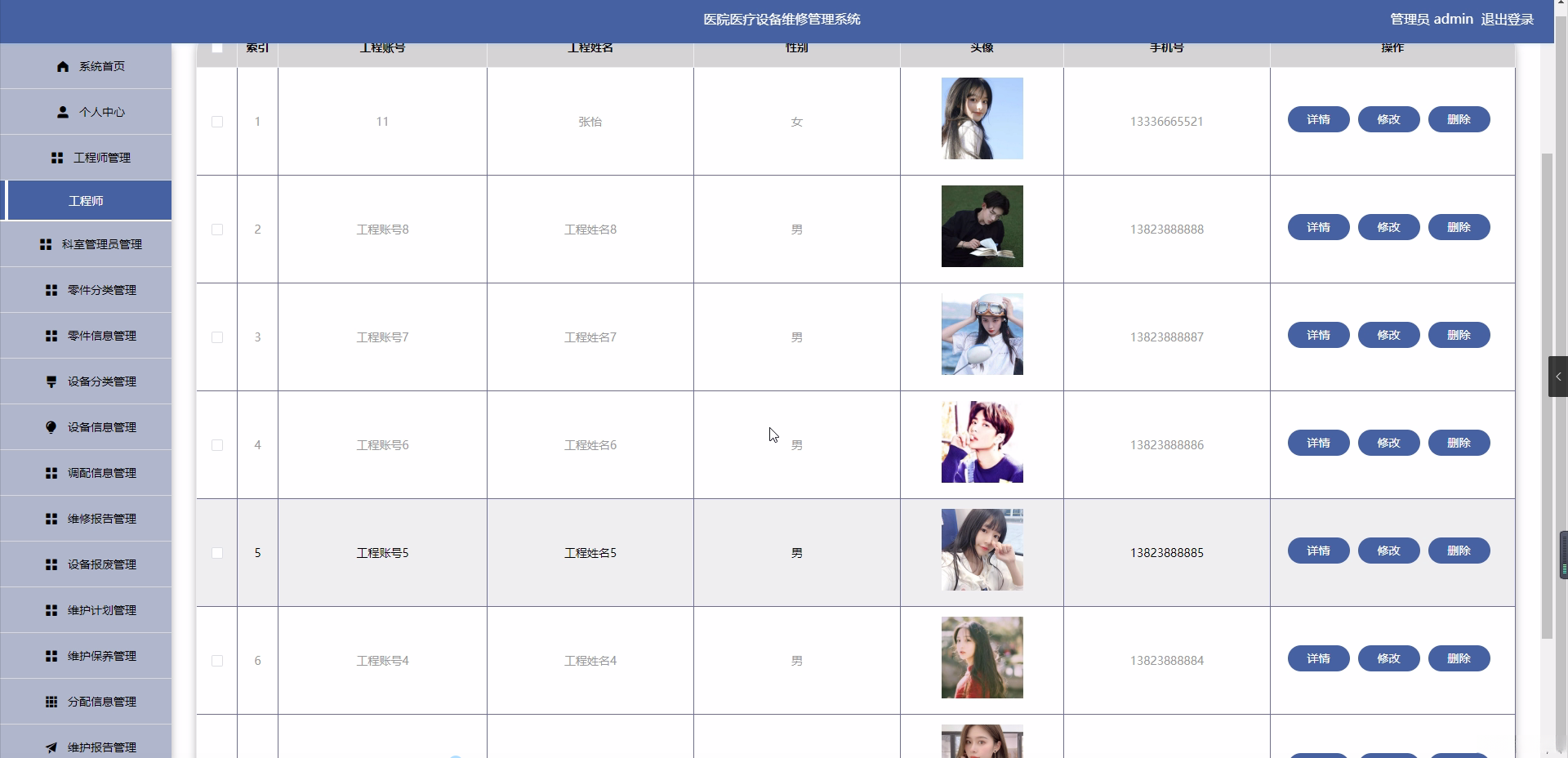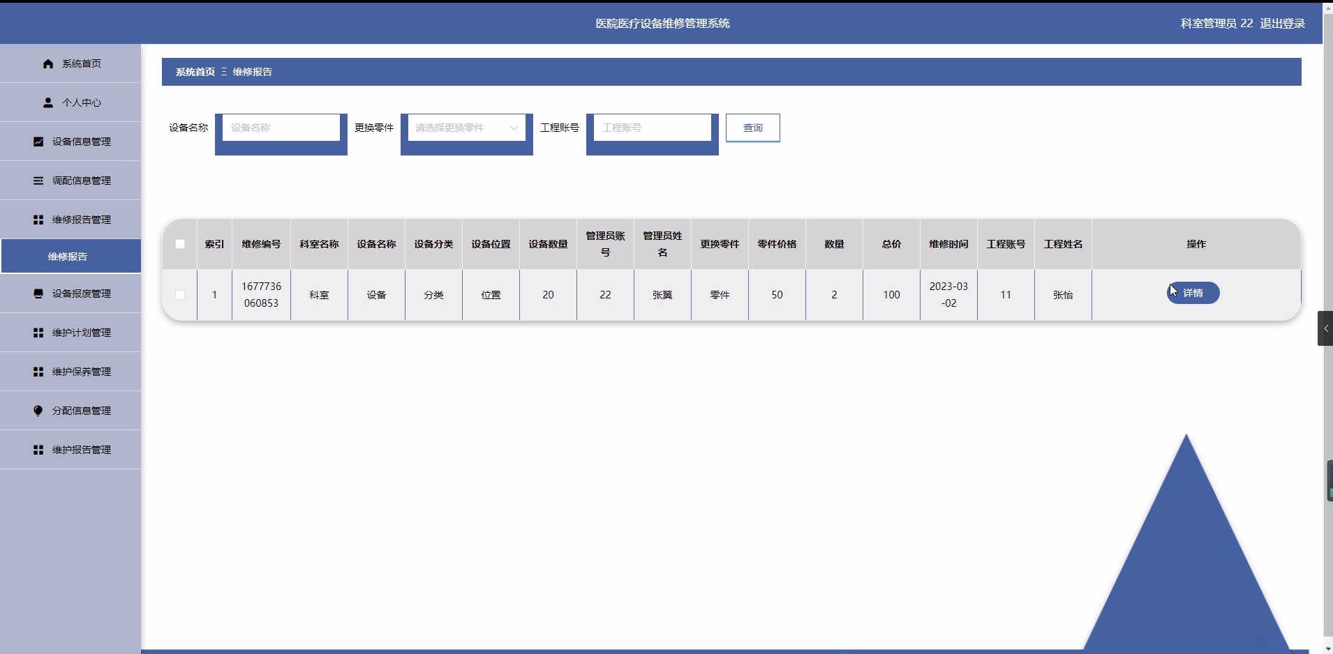 研究目的: 本研究的目的是设计和实现一个医院医疗设备维修管理系统,通过对工程师、科室管理员、设备分类、设备信息、调配信息、维修报告、零件分类、零件信息、设备报废、维护计划、维护保养、分配信息、维护报告和提醒信息等功能的设计与实现,提高医院的管理效率和质量。