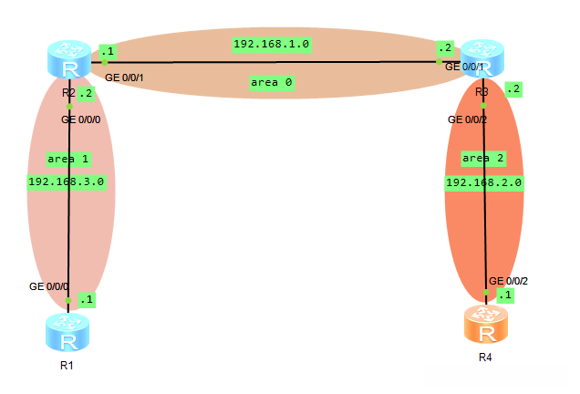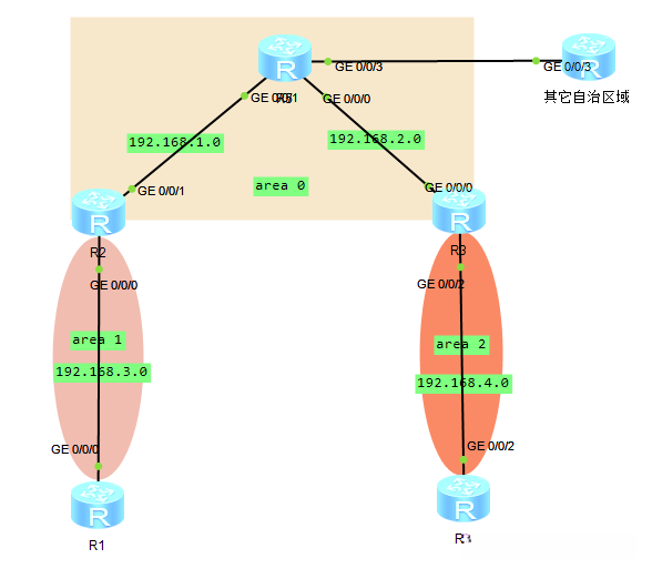 OSPF既可以支持单一领域也可以支持分域架构;其显著优势在于能够将整个网络划分为多个独立的子网;在分属架构中,默认情况下会包含核心交换机所在的主区(area 0)以及若干个辅助区;需要注意的是,在分属环境内所有分区间的通信都必须经过主区的核心节点;如果没有主区(area 0),各子区之间将无法实现通信连接;这是因为核心节点负责收集各子区中的路由信息并将其转发出去;仅当各子区均获得这些汇总信息后才能实现有效的通信连接