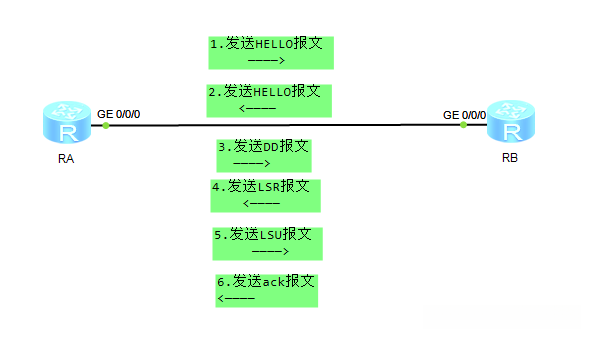在完成与邻居路由器的连接后,在线完成了链路状态数据库(LSDB)的状态更新过程。随后,在此过程中, 各个路由器会通过发送DD报文来确定为主端口,并记录自身的LSDB信息以实现网络的一致性维护
