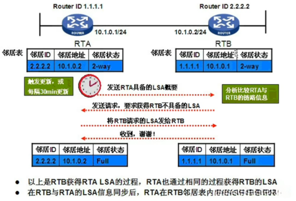 最后,在完成数据传输后,在路由器A上触发了一个确认机制LSACK,并将此操作结果反馈至路由器B以完成通信流程。在此过程中,在A与B之间建立了完全的连接状态(full)。
