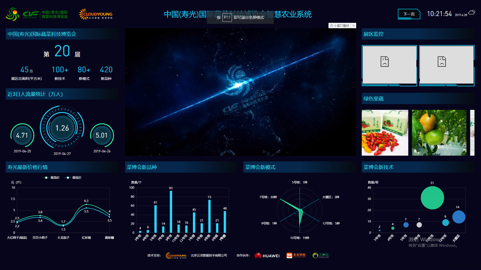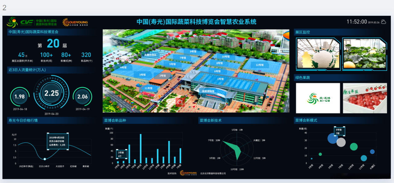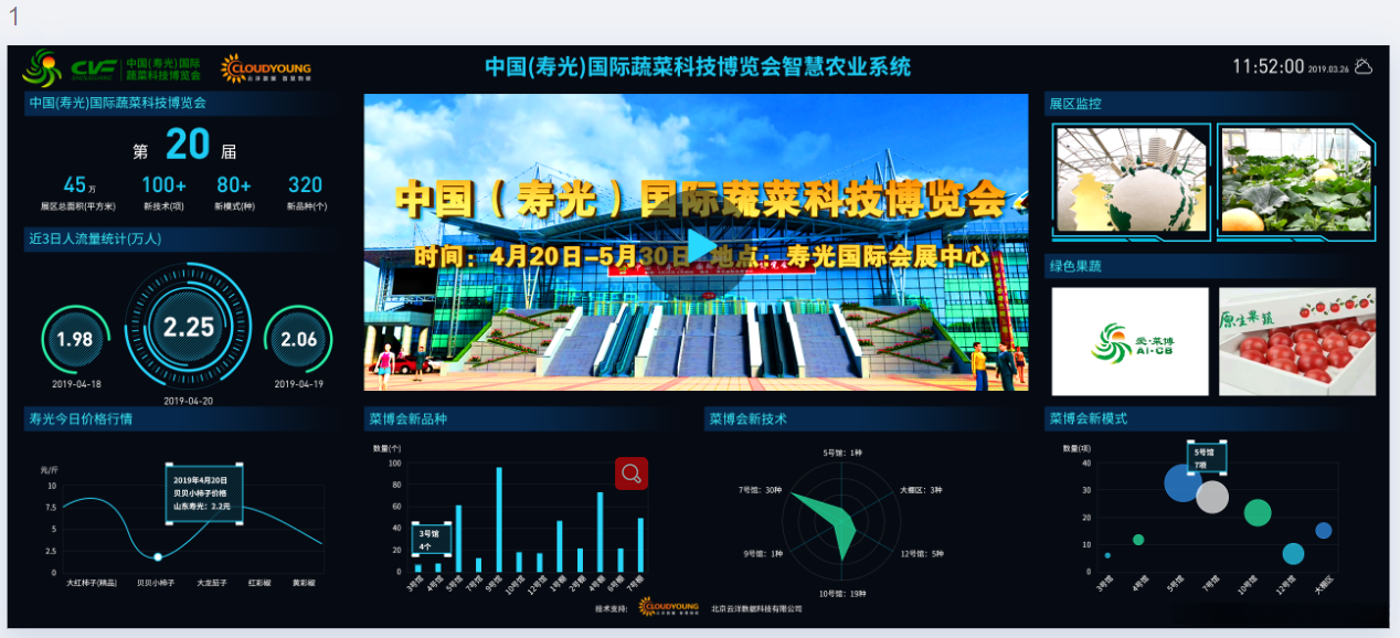 - 第一屏相关功能:实时时间、当地天气、菜博会基本信息、图表数据统计(近三日人流量、寿光最近价格行情、菜博会新品种/新技术/新模式)、展区监控、产品图展示、中间菜博会宣传视频+场馆分布介绍图切换展示、下一页;