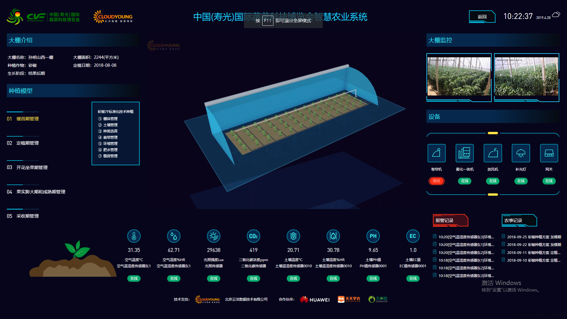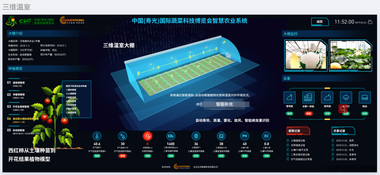 - 第二屏相关功能:实时时间、当地天气、大棚基本信息、彩椒种植模型、传感器数据展示、大棚监控、设备数据展示、报警记录和农事记录数据展示、中间大棚植物生长三维动画、返回;