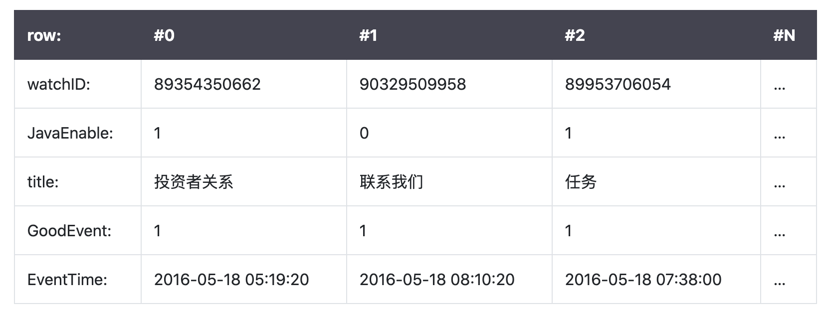 在列式数据库系统中(ClickHouse),数据按如下的顺序存储: