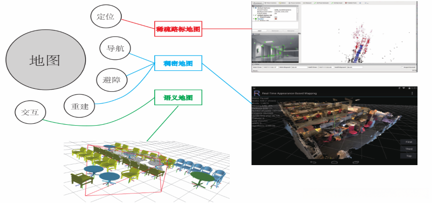 由于我们专注于讨论单目相机的稠密地图重建问题,在此情况下我们可以直接利用RGBD图像中的深度信息来生成高密度的空间表示。此外,在大多数视觉 Odometry(VO)算法中已经实现了对稀疏地图的支持,并且这些系统通常不支持用于导航与避障等更高阶的任务。因此,在实际应用中通常会同时构建并维护多层地图信息以满足不同的需求。
