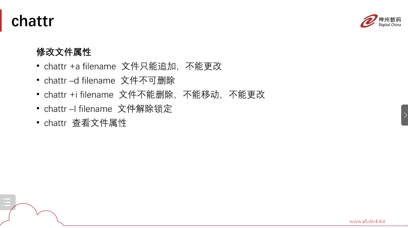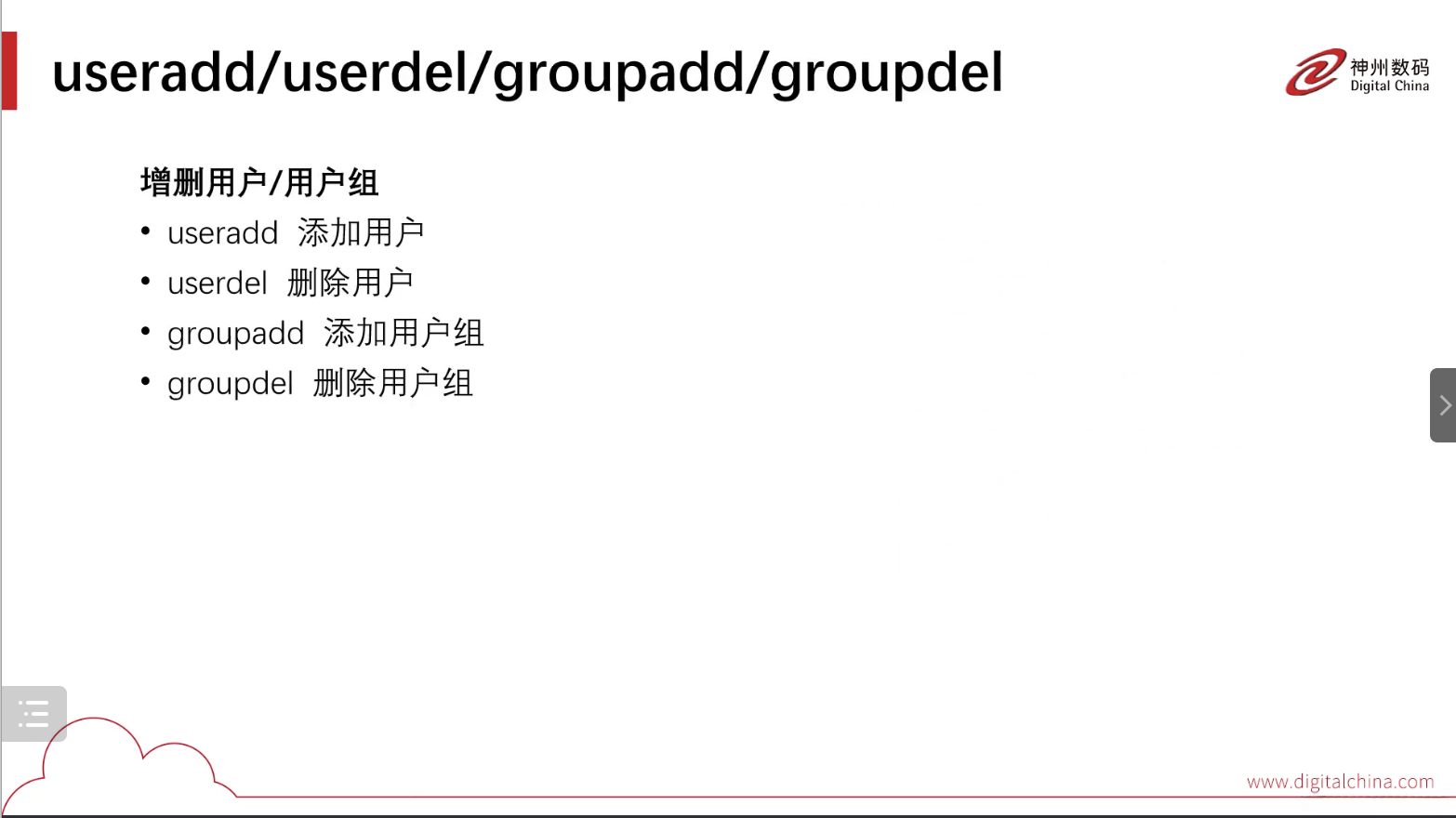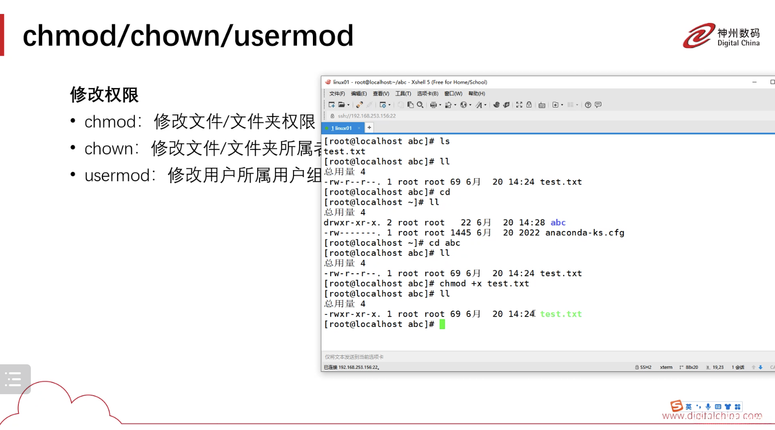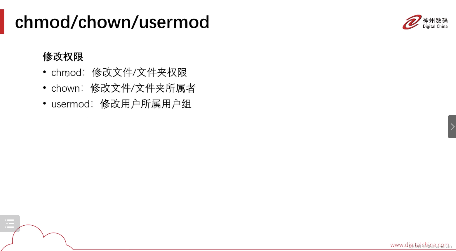 - chmod更改文件权限;chown将指定用户或组拥有特定文件;usermod修改用户属性。