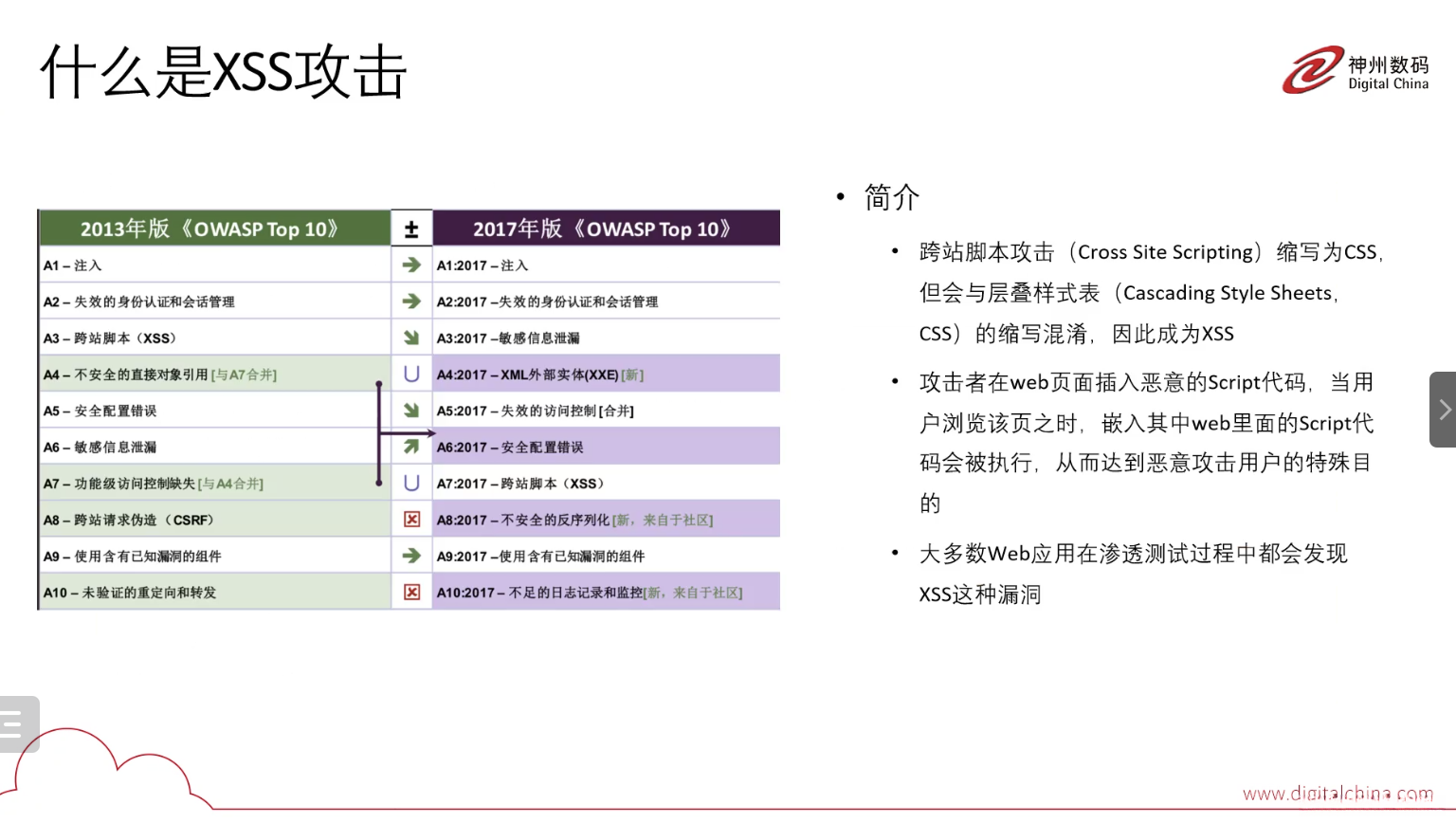 - Cross-Site Scripting(XSS)是一种跨站脚本攻击方式,在Web应用中通过用户输入的不干净数据诱导浏览器生成恶意脚本。