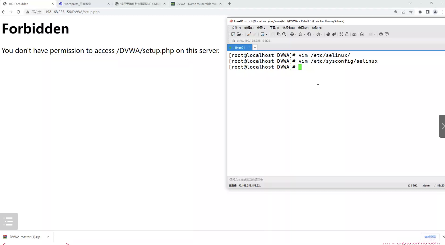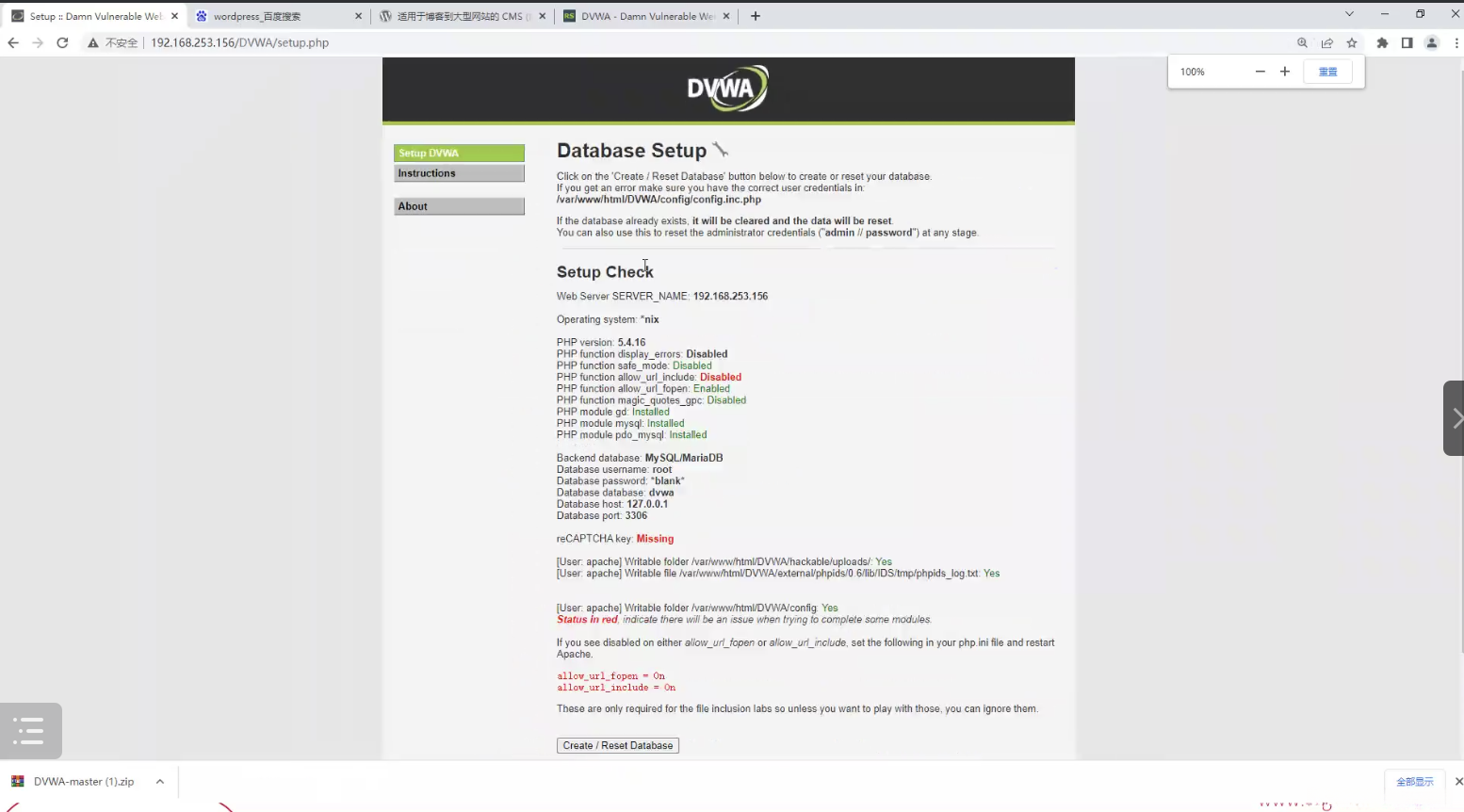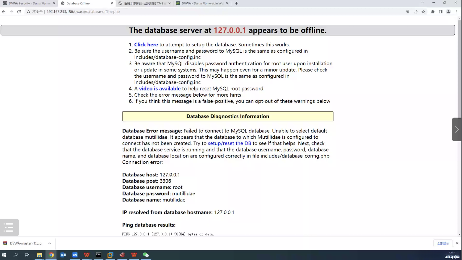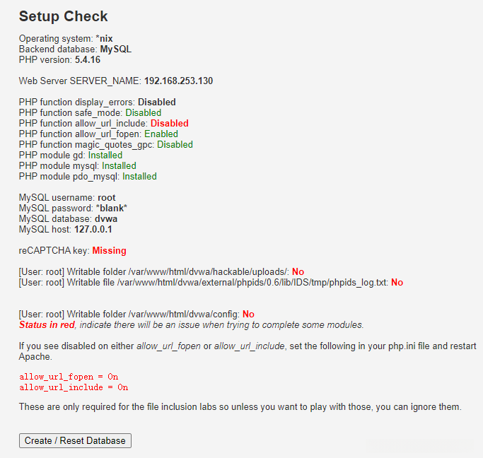 处理问题:正常情况,dvwa漏洞需要配置才能启用,红色表示不能正常使用。