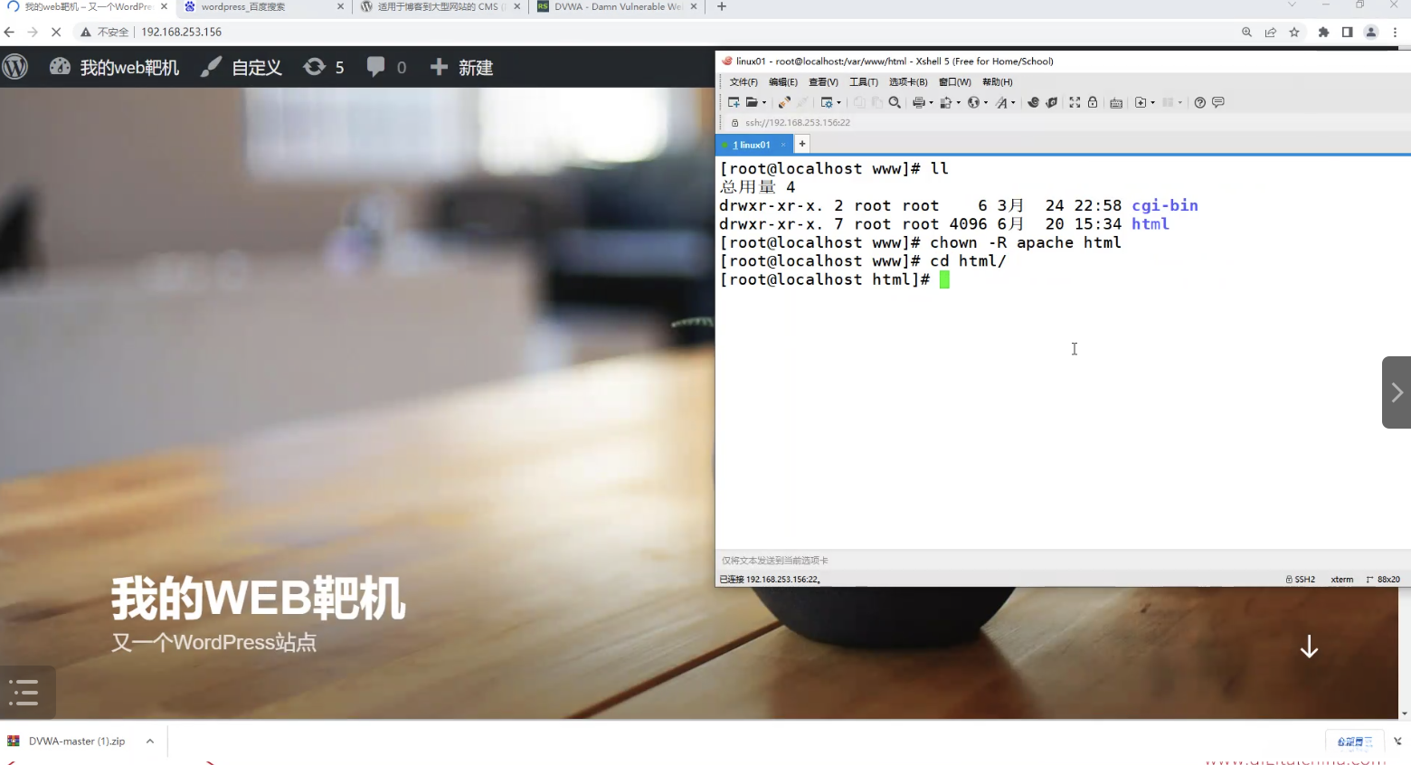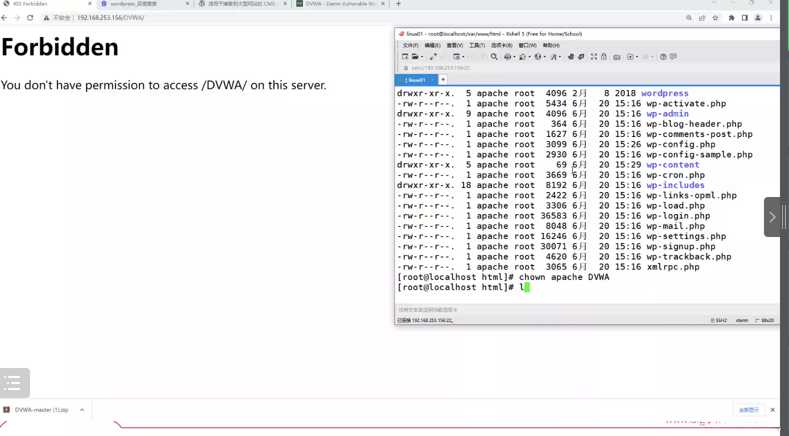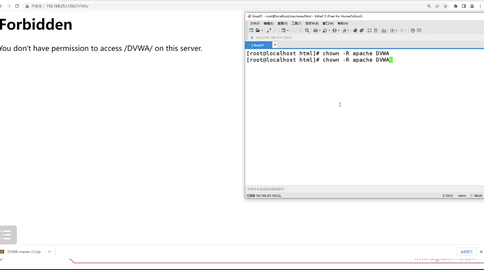 - chwon -R 命令可以在 root 用户下启用 Apache 和 DVWA服务以确保网络正常运行