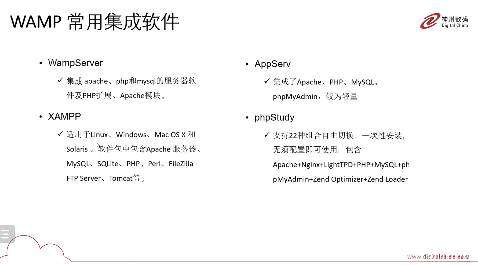 - wamp 环境包含 xampp(Apache)、AppServ(PHP 应用服务)以及 phpStudy(PHP 学习工具)等组件