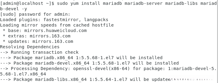 执行MySQL数据库系统的安装:通过YUM管理程序安装mariadb、mariadb-server、mariadb-libs以及mariADB-devel包,并使用-y选项完成自动部署