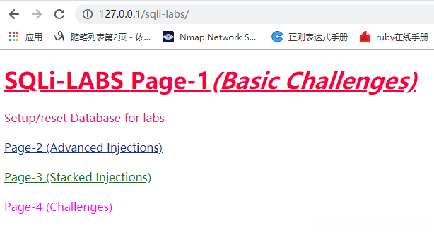 现在打开浏览器地址"http://127.0.0.1/sqli-labs/"后翻转至底部位置可以看到多个具体的注入点分布情况。这些注入点主要包含基础SQL注入、高级SQL注入、SQL堆叠注入以及挑战漏洞四个主要类别。具体而言,在该页面上总共有大约75个可利用的漏洞供安全研究者进行分析和利用。