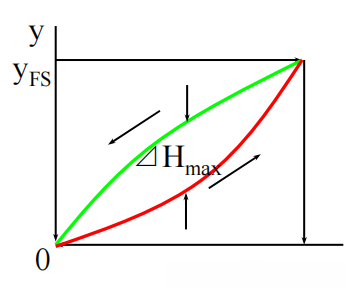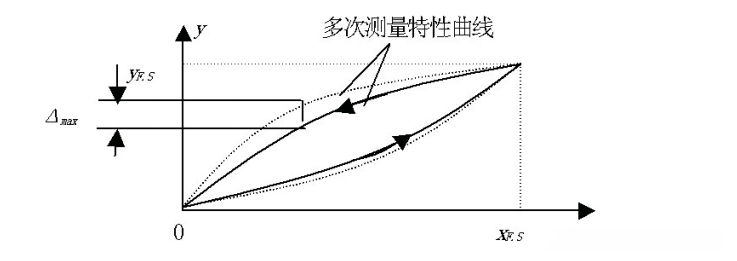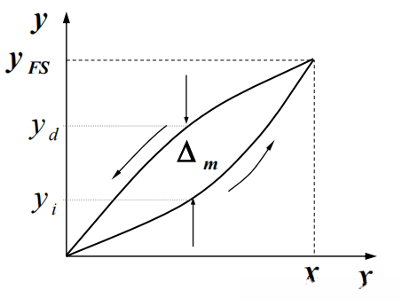 传感器在前向(正向)和后向(反向)工作范围内输出输入特性曲线不一致的程度。对于同一大小的输入信号x,在x递增的过程中对应某一输出量为y_i;在x递减的过程中则对应另一系列不同的输出量y_j。