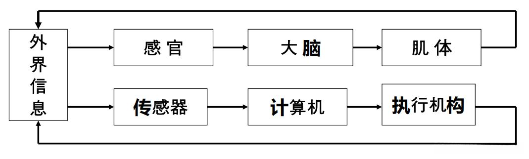 机器类似于人类的大脑;运作系统如同人体的肌肉组织;感觉装置对应于人类的眼睛、耳朵等感官器官。