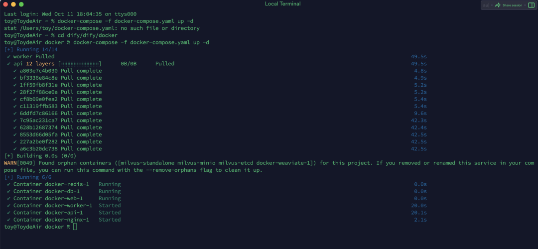 运行以下命令:$ docker-compose -f docker-compose.yaml up -d 旨在启动 Dify 的基础服务组件集合。