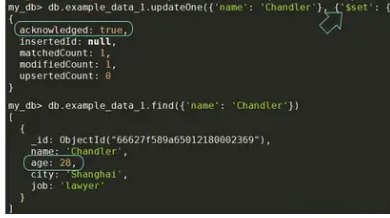 在本节中,我们建议将find替换为更高效的函数名称updateMany。在此基础上添加更新逻辑:json{'$set': {'city': 'Beijing', 'job': 'programmer'}}```