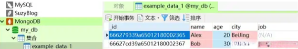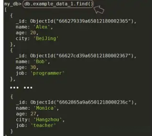 随后继续将一条新的文档插入到集合 example_data_1 中;相较于之前的做法,在数据结构上有所改进:新增了一个字段 job,并缺失了 city 字段。