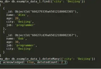 文档的删除命令也被划分为deleteOne和deleteMany两种类型。其中前一种命令仅负责处理第一条符合条件的信息,而后一种则会清除所有符合指定条件的信息。