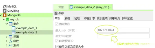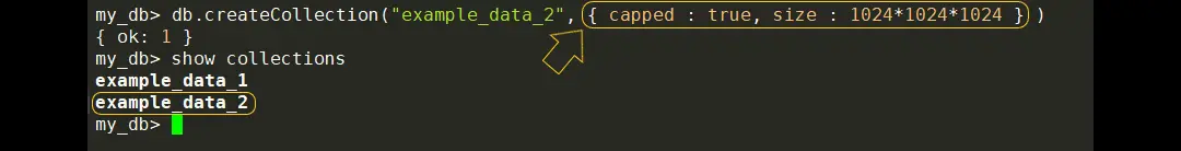 在初始化example_data_2集合时设置了capped字段为true值,这表示该集合将启用一个数据上限限制机制,在集合文档数量达到预先指定的上限(此处由参数size确定)之前不会进行数据覆盖操作;具体而言,在集合文档数量达到该上限后将覆盖之前的存入数据,默认情况下该上限值被设定为1 GB