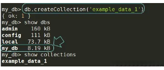 接下来,在调用db.createCollection执行操作时会生成新的集合结构;当完成此操作后才能查看到被创建的数据库 my_db ,可以通过运行 show collections 命令来获取相关信息以了解已建立的集合情况