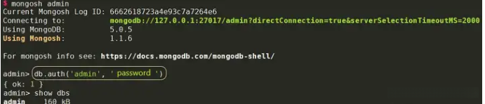 运行 mongosh admin 能够方便地打开一个 Mongo Shell 并将默认数据库设置为 admin;如果希望更改默认数据库,则应选择命令 use admin 进行切换。