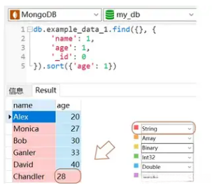 该命令按age字段进行升序排序;然而最后一条记录中的数值 28 实际上是以字符串形式存储为 '28' ,因此与我们预设的排序结果不符。这也反映出为何我们需要确保 MongoDB 数据库中同一集合内各字段保持统一的数据类型而采取的一种必要措施;如果不这样做可能会遇到不可预见的问题。