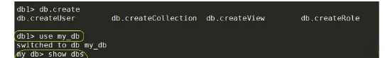 在 MongoDB 中, 创建数据库本质上就是调用一个不存在的新库, 但是在此期间, 数据库仍然未被真正地生成. 唯一的变化仅仅是终端窗口切换成了 my_db> 这一名称.