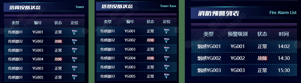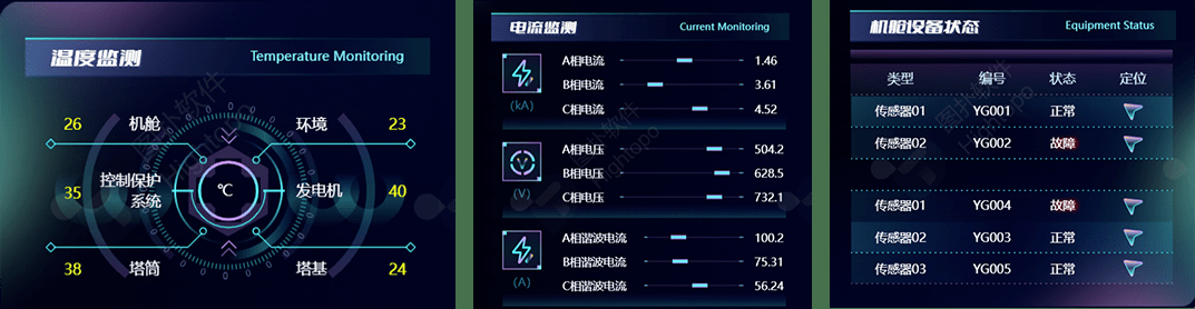 消防监测模块主要是通过各种对接风电机组内各个位置布局的传感器,实现温度、电流、机舱设备进行全方位、深层次的获取和数据实时展示。