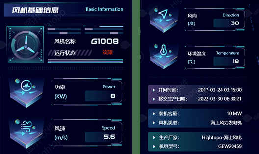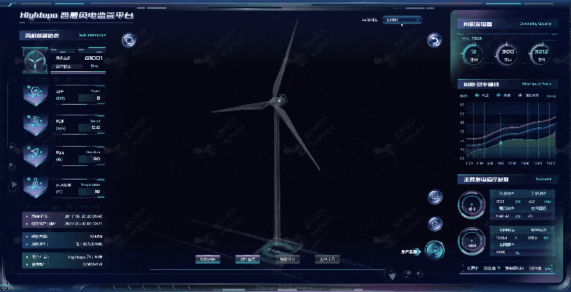 图扑软件利用自主研发的 HT for Web 产品,搭建出了风机系统内在发电工艺的三维模型。1:1 还原风机的外部结构以及主要部件,并通过对接物理传感器的实时数据,还原风机各个部件的关键数据,构建风电场机组全面的生产感知力,实现环境、电量、性能可视化。