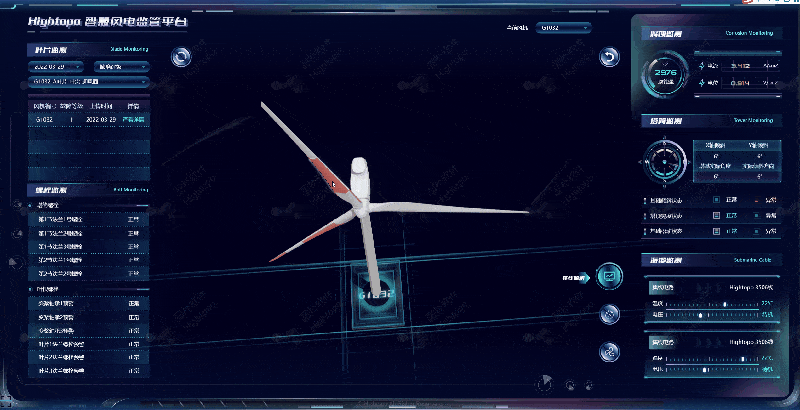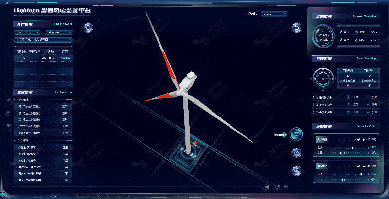 图扑软件依托自主研发的 HT for Web 产品,搭建出一套面向大型风力发电机管理的数字孪生系统,涉及在线监测、消防监测和生产监测三大监测模块。通过提供风机全生命周期可视化管理的解决方案,帮助客户降低成本,提升管理效率。用户可通过不同的监测模块,实现 360 度选择查看对应的监测内容数据,对场景进行放大缩小平移等操作查看场景效果、数据指标、设备状态等。