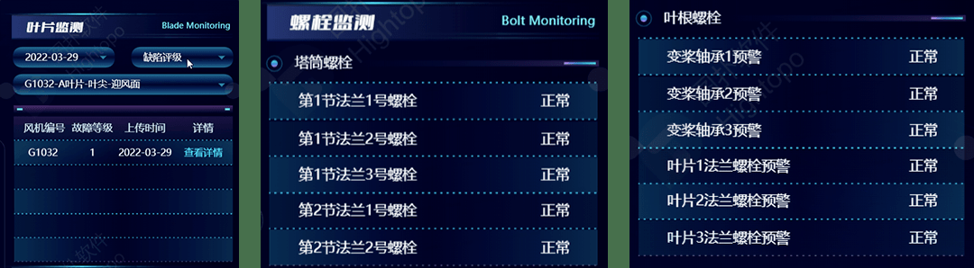 塔筒螺栓和叶根螺栓在线监测模块可以实时监测风机关键位置连接螺栓的紧固状态、反旋松动、螺栓预紧力偏差等数据,有效保障机组的安全稳定运行。