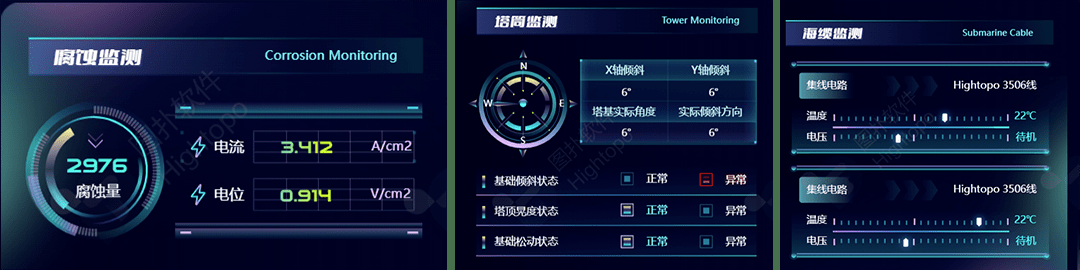 传统的腐蚀监测主要是在停车检修期间安装和取出挂片进行检测,需破坏材料的结构,试验时间长,而且得到的结果往往是整个试验周期中产生腐蚀的总和,不适于现场使用。图扑软件通过对接腐蚀传感器以及环境多因素传感器,展示设备安装点的腐蚀电流、电位、腐蚀量等参数,从而有效表征环境腐蚀性,为海上风电的腐蚀原因及制定相对应的防腐蚀措施提供了科学依据。