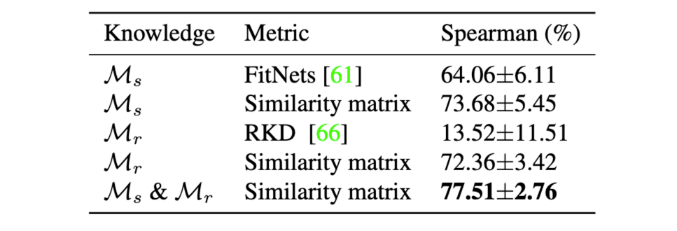 表 4 说明本文提出的语义相似度优于 FitNets,关系相似度优于 RKD,且两者存在互补性,共同作用能获得更好的相关性结果。