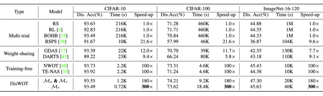 如表 3 所示,DisWOT 以最低的训练成本实现了近乎 SOTA 的性能表现。尤其是在 CIFAR-10 数据集上,比需要训练的 NAS 方法提速了 180×。