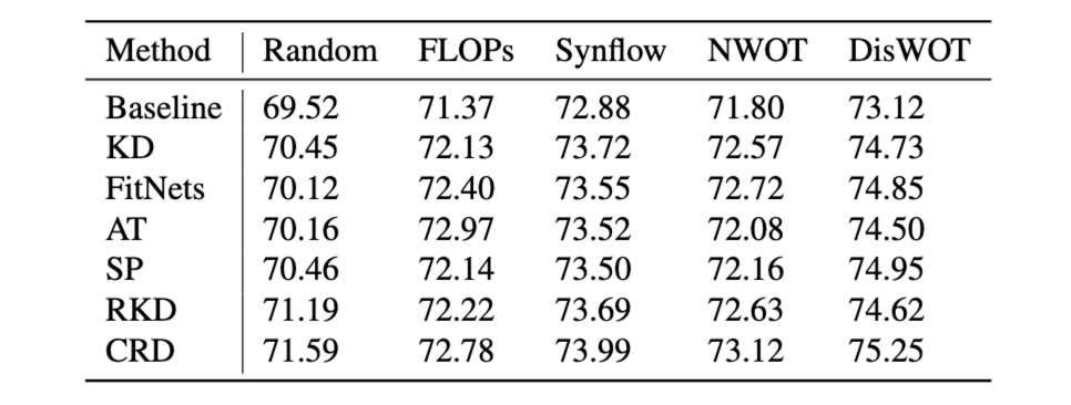 如表 1 所示,DisWOT 在不同 KD 方法上都取得了超过其他 Zero-cost proxy 方法的性能表现,这说明了本文所提出的基于 DisWOT 的搜索方法的有效性。
