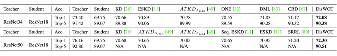 如表 2 所示,DisWOT 在不同教师和不同蒸馏策略下都取得了超过对照组的性能表现。