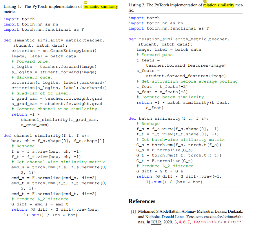 为了证明搜索得到的学生模型架构的优越性,本文最初采用了原始的蒸馏损失(例如 KL 散度)。但不难想象,NAS 阶段的度量指标(语义相似度和关系相似度)也可以作为 KD 阶段知识转移的优化目标 ,这将进一步提升学生模型的蒸馏性能,即: