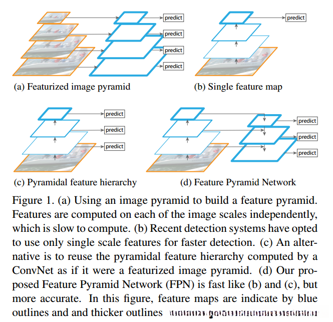 (d) 就是本文要说的FPN,它从高层携带信息传给底层,每层都依次融合后,再分层预测。