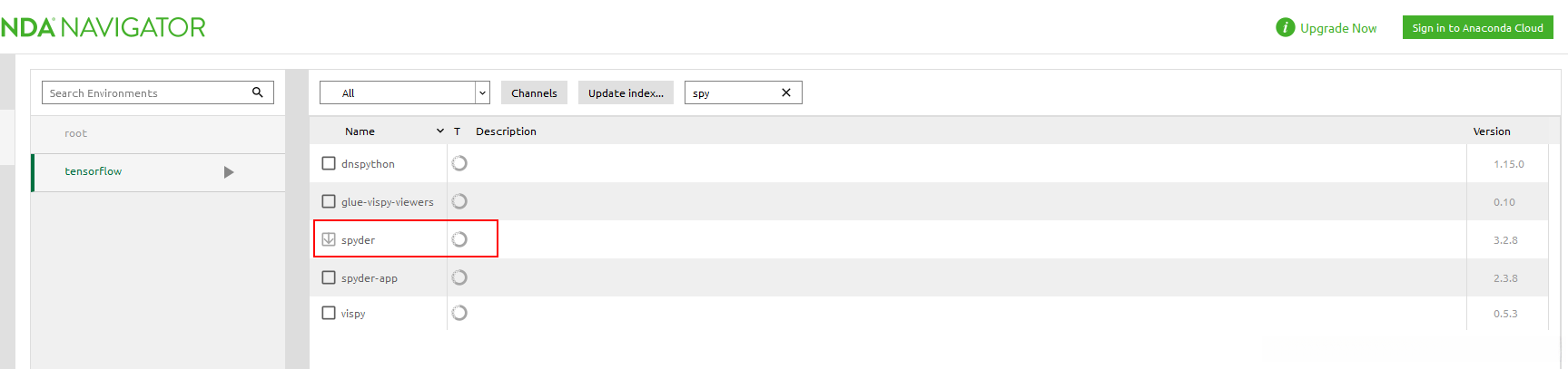 打开Anaconda Navigator,选择到tensorflow虚拟环境下再进行安装。