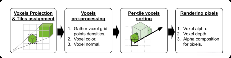 ,利用公式(5)从它们的球谐系数计算与视角相关的颜色,并通过公式(6)推导出体素法线。在渲染过程中,预处理的体素属性在所有像素之间共享。