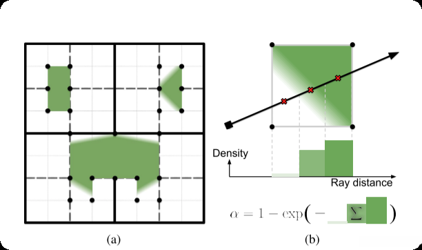 图2。稀疏体素场景表示。(左)我们在八叉树布局下分配体素。每个体素都有自己的球面谐波系数,用于依赖于视图的外观。在渲染视图时,颜色场近似为体素内的常量,以提高效率。密度场在体素内呈三次线性变化,并由每个体素的角网格点(即黑点•)上的密度值建模。网格点密度在相邻体素之间共享。(右)我们在射线-体素交点段内均匀采样K个点,计算其对像素射线贡献的alpha值的体积分。详细信息请参见第3.1.1节。