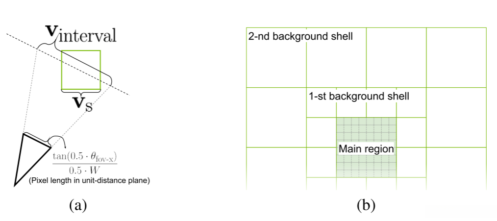 图5。体素采样率和网格布局初始化的可视化。(a)我们可视化了Eq.(7)中定义的体素采样率。(b)我们描绘了不同壳层下的前景主区域和背景区域。在无界场景中,我们对前景和背景区域采用不同的网格布局初始化策略。详见3.2.1节。