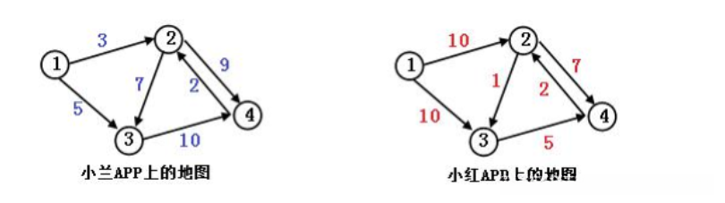 第一行两个数值N、M分别代表交叉口数量以及单向道路的数量;随后输入的M行数据中每一行都包括四个数值u、v以及两个权重值w₁、w₂。其中u和v为起点和终点节点编号;w₁和w₂分别代表在小兰使用其App平台以及小红使用其App平台时对这条道路估算的成本权重值。每条单向道路都以这样的方式被记录下来。