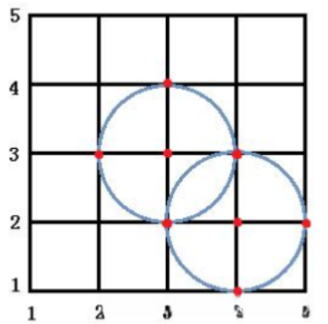 在5×5网格区域内位于格点(3,3)和格点(4,2)处有两个基站,在工作半径均为1的情况下