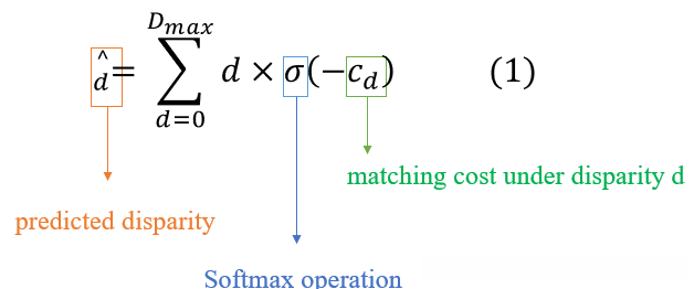 计算对于每一个像素点属于每一个视差值的概率,匹配代价卷经过3D CNN和上采样处理,得到在所有视差下每个像素的匹配成本,成本越大则表示匹配的概率越低,因此取预测成本的负值,并通过softmax操作进行正则化处理,得到每个像素属于不同视差的概率;然后,以概率值作为权重,对视差进行加权求和,得到每个像素点处的视差值