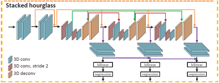 - 堆积沙漏3维CNN和中间监督机制来调整代价量,重复处理代价量,更好的提高全局环境信息的利用率