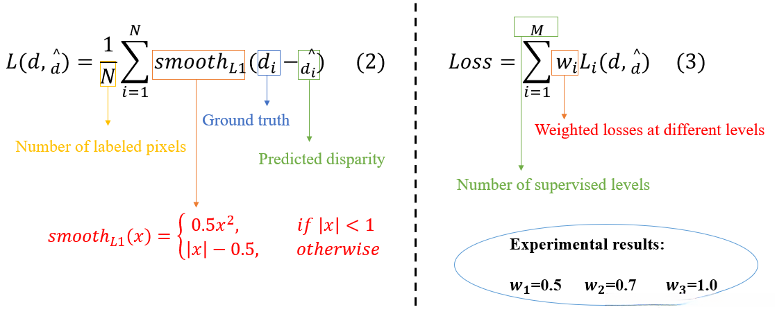 采用了一种深度监督的训练方式,不仅对网络最终的输出结果进行监督,并且对网络中间层级得到的结果进行监督。就是对每个编码解码结构输出的卷进行视差回归,并计算损失