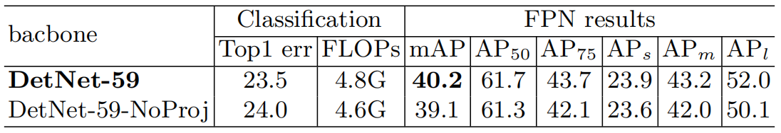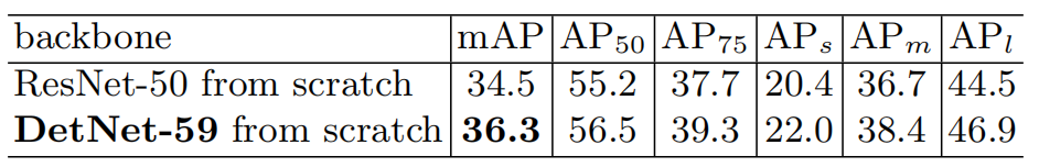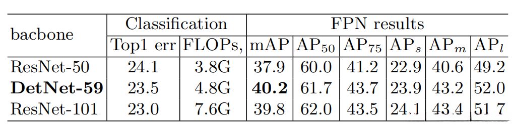 从上表中可以看到,DetNet在各方面都是碾压ResNet-50的。其中参数含义如下: