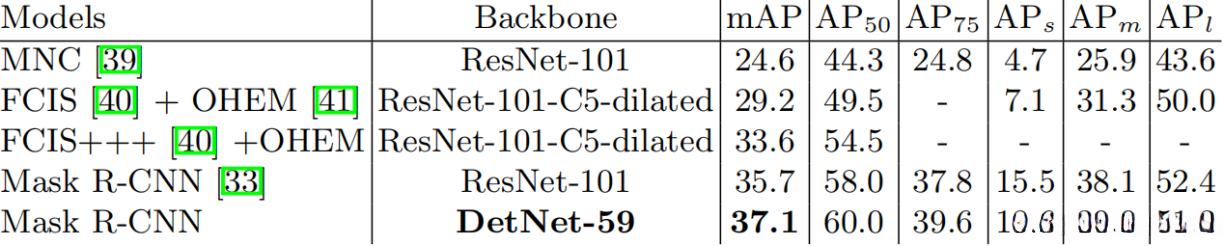 作者还把DetNet与Mask-RCNN联合在一起等,结果如下表所示。
