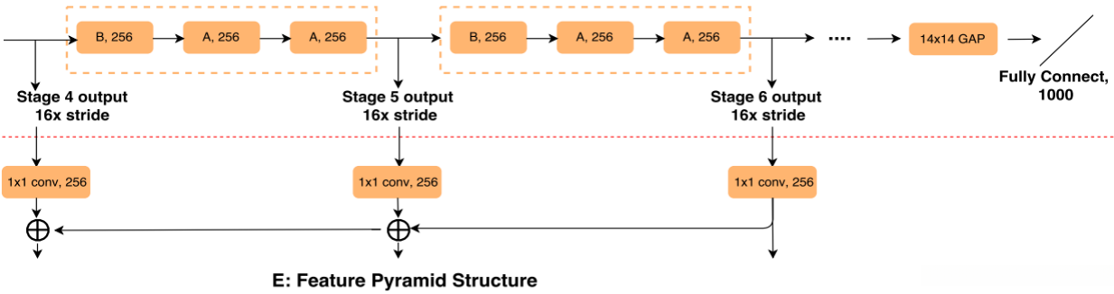 将DetNet与FPN结合,参考了ResNet50+FPN的做法,直接保留了前四个阶段,修改第五阶段,并新增第六阶段,如下图所示: